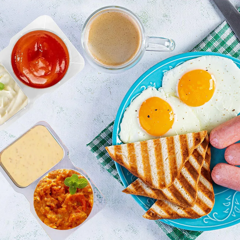 Praktisches Zwei-Fach-Design: Die intelligente Unterteilung erlaubt die getrennte Aufbewahrung von zwei verschiedenen Lebensmitteln oder Saucen in nur einer Box, ohne dass sich Aromen vermischen.