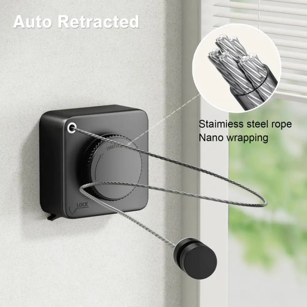 Die FlexiLine™ ist Ihr platzsparender Wäschetrockner, der sich bei Bedarf blitzschnell auf eine stolze Länge von 4,2 Metern auszieht und nach Gebrauch wieder unsichtbar in sich zusammenrollt. Die stabile Edelstahl-Seilkonstruktion trägt bis zu 18 Kilogramm Wäsche und wird durch eine clevere Spannvorrichtung straff gehalten, sodass auch schwere Kleidungsstücke nicht durchhängen. Einfach an der Wand montiert, ist diese Trockenleine die perfekte Lösung für Balkon, Bad, Wohnmobil oder Kleingarten – immer griffbereit und doch kaum sichtbar, wenn sie nicht gebraucht wird.