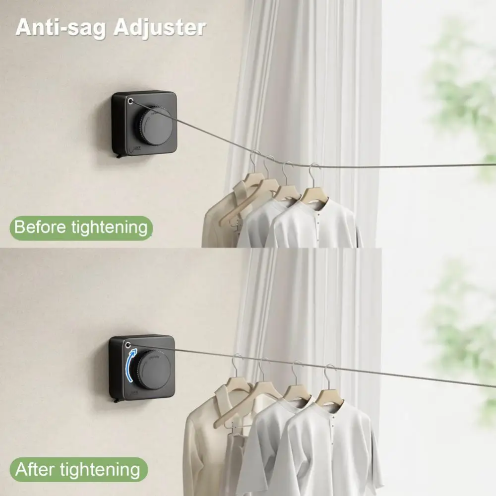 Integrierter Spannmechanismus gegen Durchhängen: Ein praktischer Drehknopf am Gehäuse spannt das Seil nach dem Ausziehen, um ein Durchhängen der Wäsche zu verhindern.