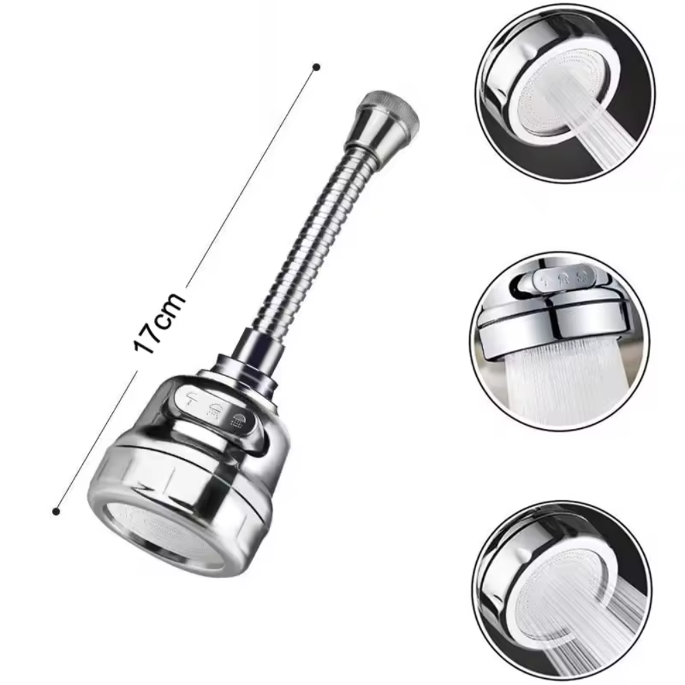 Der KüchenJet™ ist die perfekte Ergänzung für jede Küche oder jedes Badezimmer. Mit seinem um 360° drehbaren Design, drei einstellbaren Strahlmodi und einer wassersparenden Funktion bringt er Komfort und Effizienz direkt an Ihren Wasserhahn. Der Aufsatz reduziert Spritzwasser, sorgt für einen weichen Wasserfluss und spart dabei wertvolles Trinkwasser. Die hochwertige Verarbeitung aus rostfreiem Edelstahl und langlebigen Dichtungen garantiert eine lange Lebensdauer ohne Tropfen oder Korrosion – ideal für tägliche Aufgaben wie Geschirrspülen, Obstwaschen oder Händewaschen.