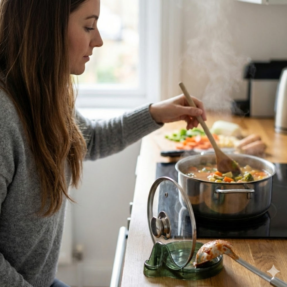 Besonders während der Zubereitung komplexer Mahlzeiten führen tropfende Deckel und schmutzige Kochlöffel zu einer unhygienischen Arbeitsumgebung, die den Kochfluss stört. Dieser „Drip-Disgust“ – der Ekel vor klebrigen Rückständen – macht das Aufräumen nach dem Essen zur Qual. LidNest™ beendet dieses Problem sofort: Die integrierte Auffangrinne sammelt Kondenswasser und Fett sicher ein, während die spülmaschinenfeste Silikon-Oberfläche die Reinigung zum Kinderspiel macht. Es ist die ideale Lösung für alle, die eine makellose Küche lieben und ihre Zeit lieber mit Genießen als mit Putzen verbringen.