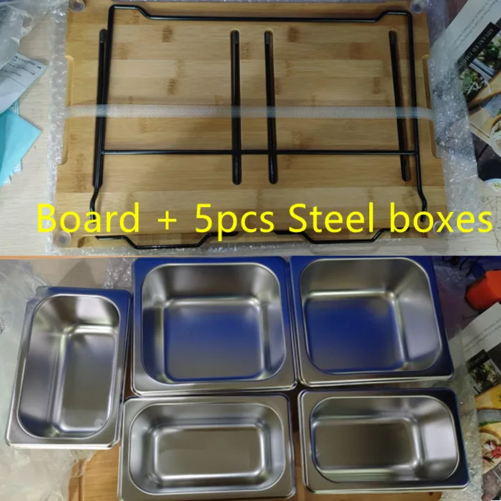 - Rutschfeste Füße & einfache Reinigung: Integrierte Gummifüße sorgen für Stabilität beim Schneiden; Brett und Schalen sind spülmaschinengeeignet (außer dem Holzbrett).