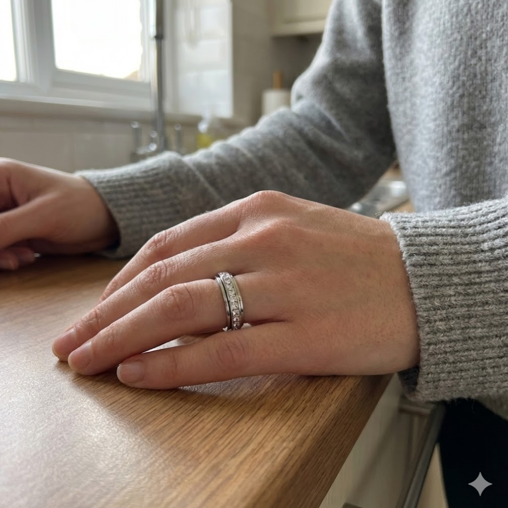 Für viele Berufstätige und Studenten ist Stress ein ständiger Begleiter, der sich in unbewussten, oft störenden Gewohnheiten zeigt. Das Verlangen nach einer haptischen Beschäftigung ist ein natürlicher Mechanismus zur Erdung, doch herkömmliche „Fidget-Toys“ wirken oft deplatziert oder unprofessionell. ZenVibe™ löst diesen Konflikt durch die perfekte Symbiose aus Luxusschmuck und Wellness-Tool: Der frei rotierende Ring bietet eine diskrete, beruhigende Funktion, die Ihnen hilft, Ihre Nervosität abzubauen, während Sie nach außen hin vollkommene Gelassenheit ausstrahlen. Es ist die elegante Lösung für den „High-Focus“-Profi, der mentale Stärke mit ästhetischem Anspruch verbindet.